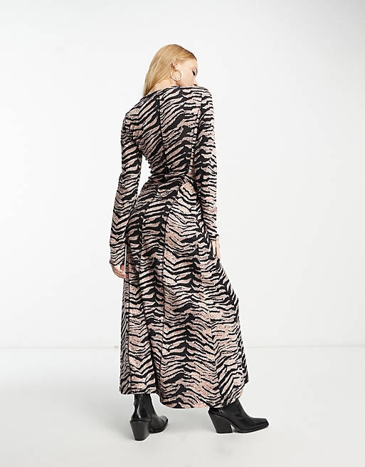 ASOS DESIGN long sleeve rib midi dress with contrast stitch detail in animal print