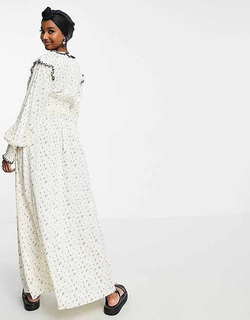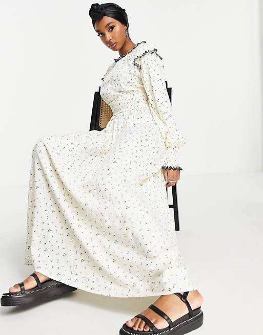 ASOS DESIGN shirred waist maxi ditsy print dress with contrast stitching in white