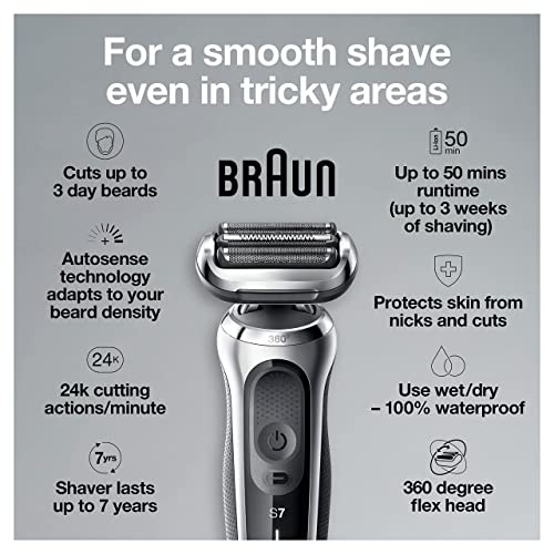 Braun Series 7 7020s Flex Electric Razor for Men with Precision Trimmer, Wet & Dry, Rechargeable, Cordless Foil Shaver, Silver