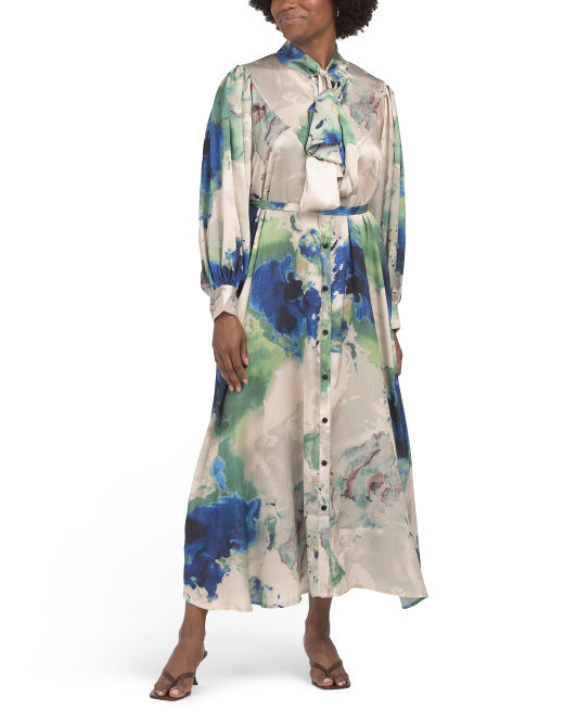 DALIA MACPHEE Long Sleeve Marble Printed Tie Neck Maxi Dress