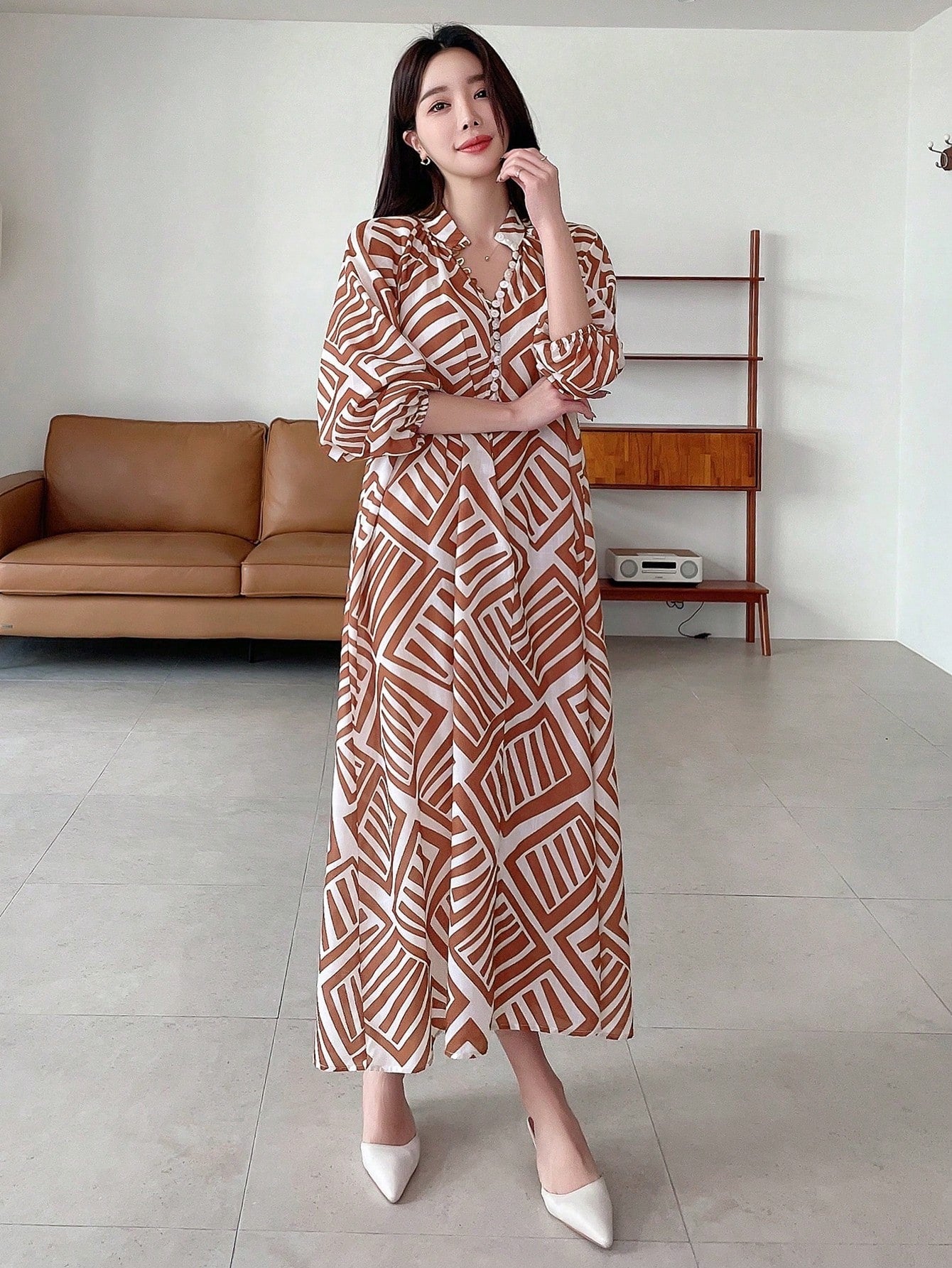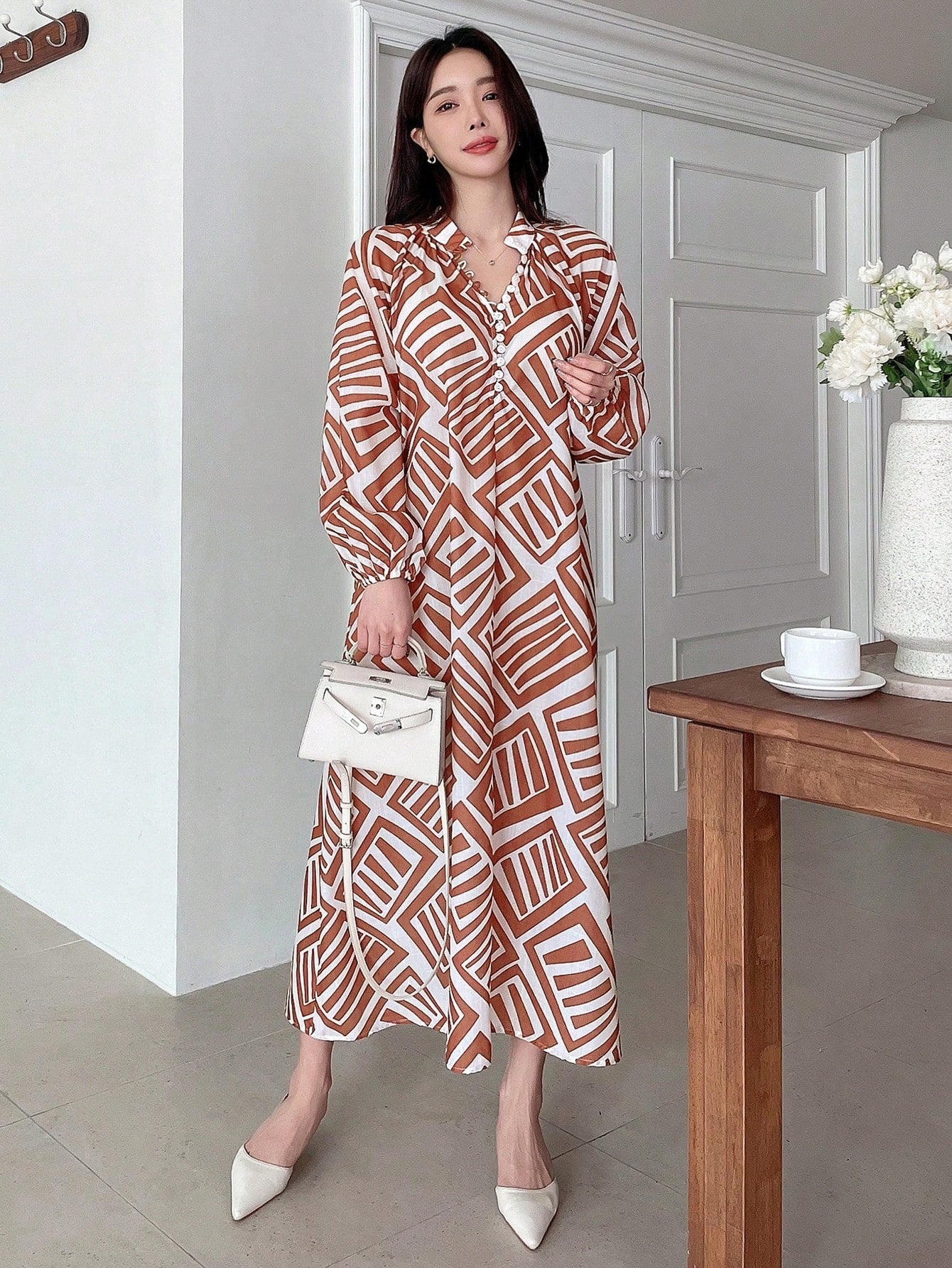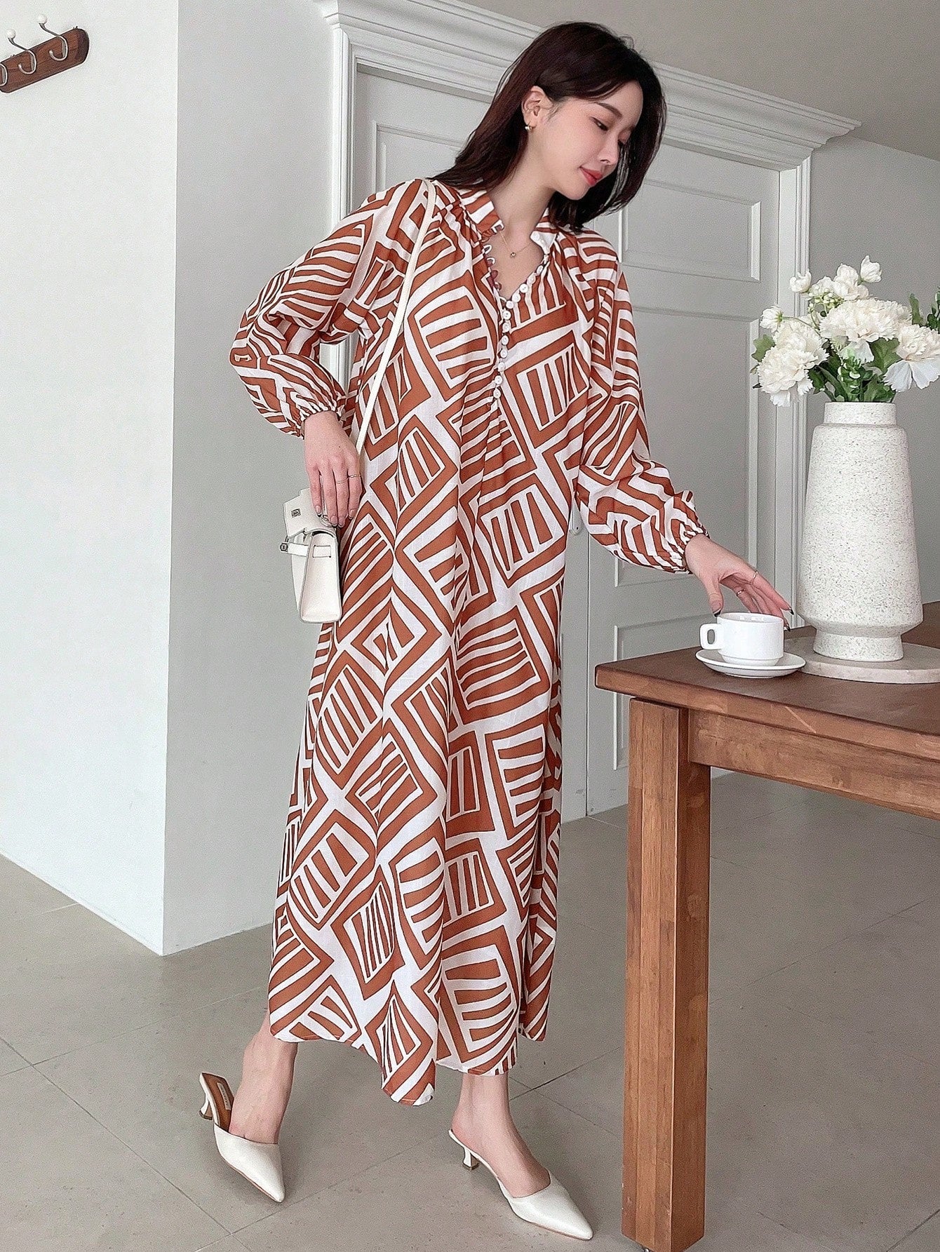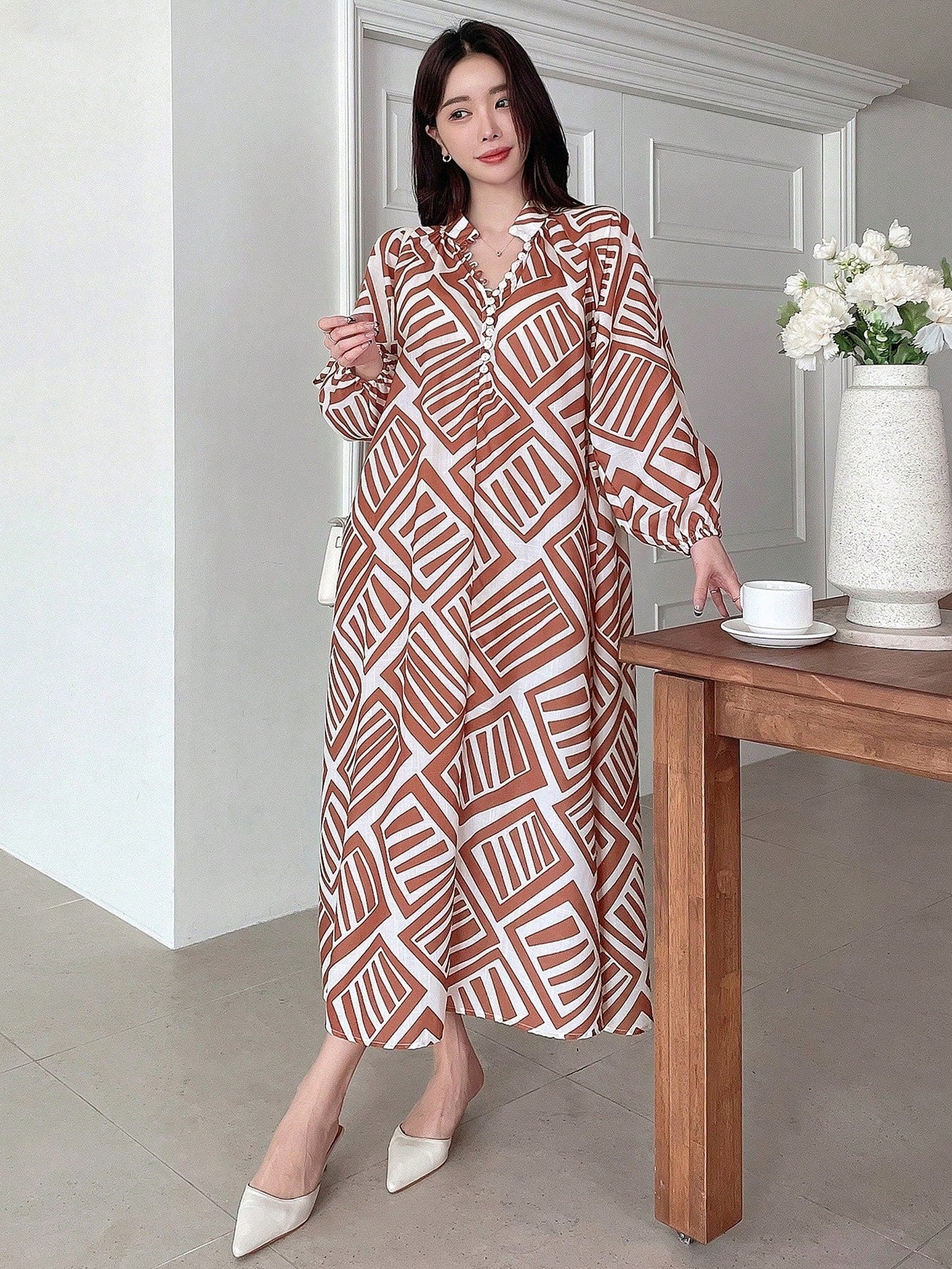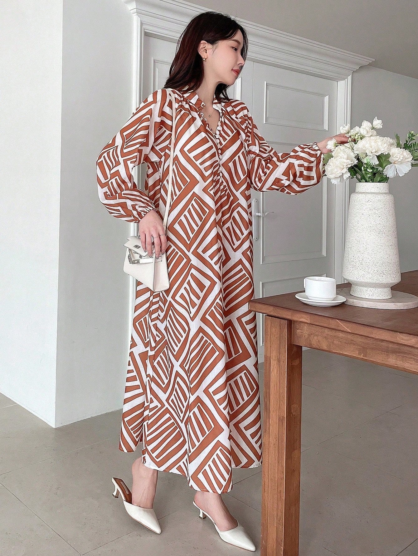 DAZY Women's Graphic Printed Long Sleeve Lantern Sleeve Dress