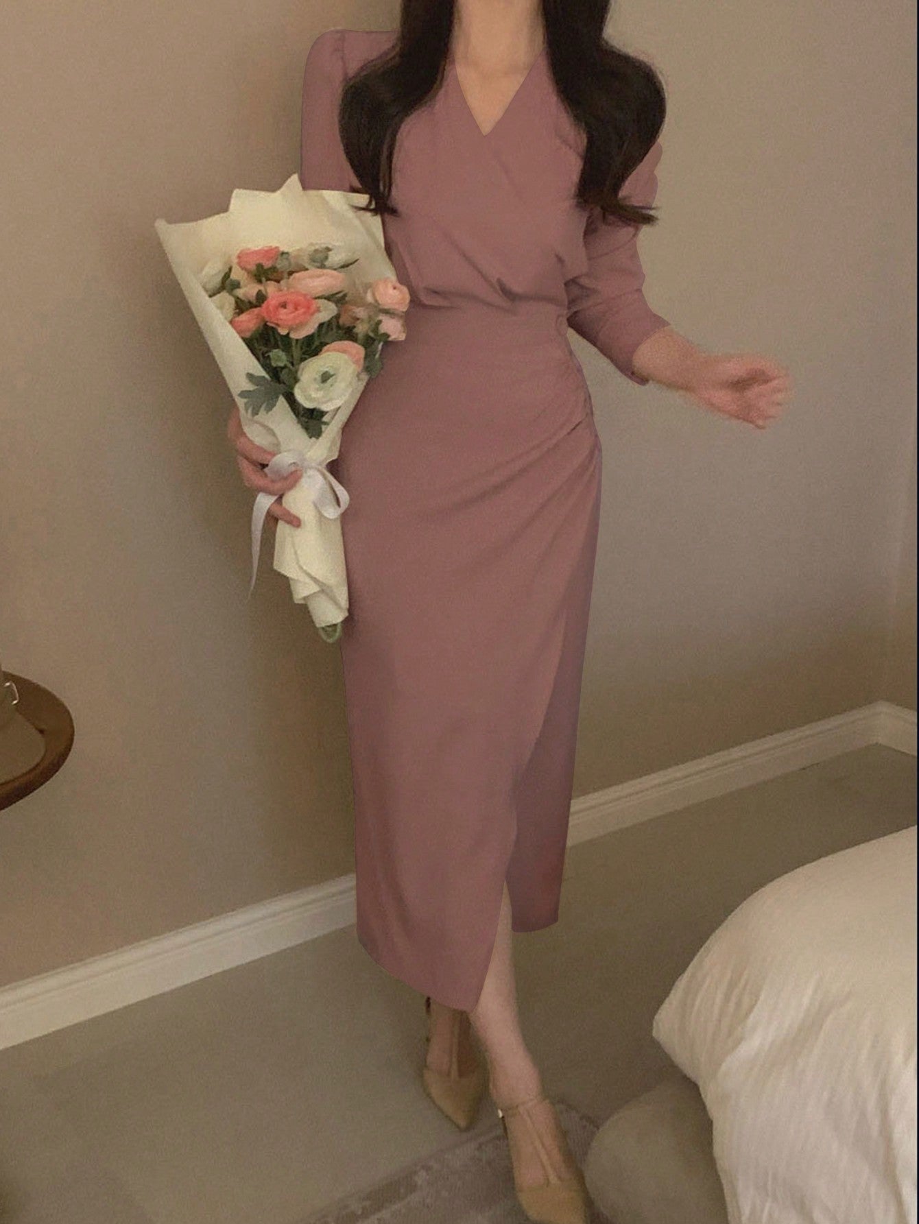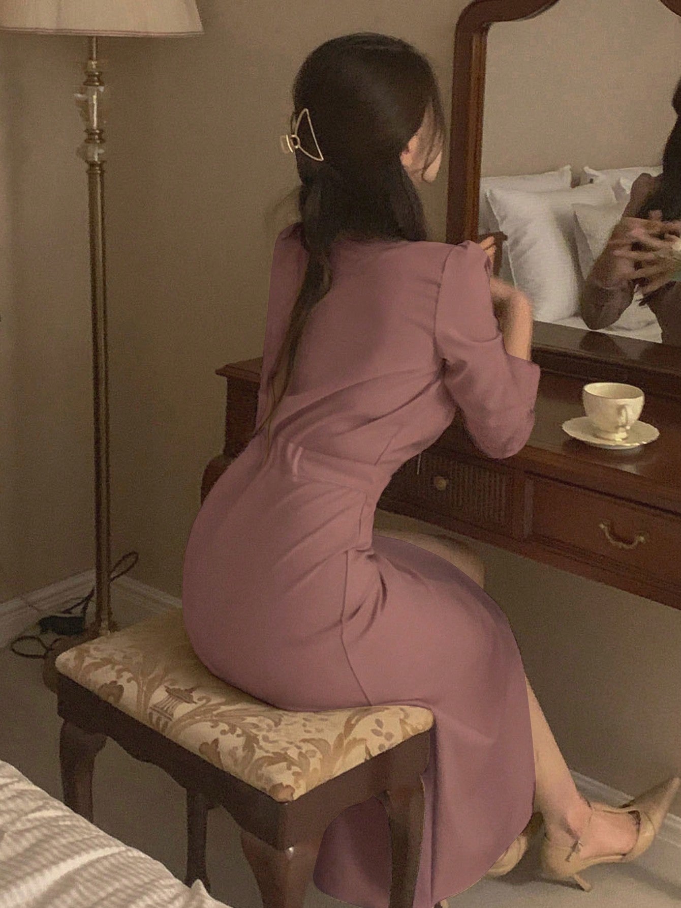 DAZY Women's Spring V-Neck Long Sleeve Maxi Dress With Waist Tie And High Slit