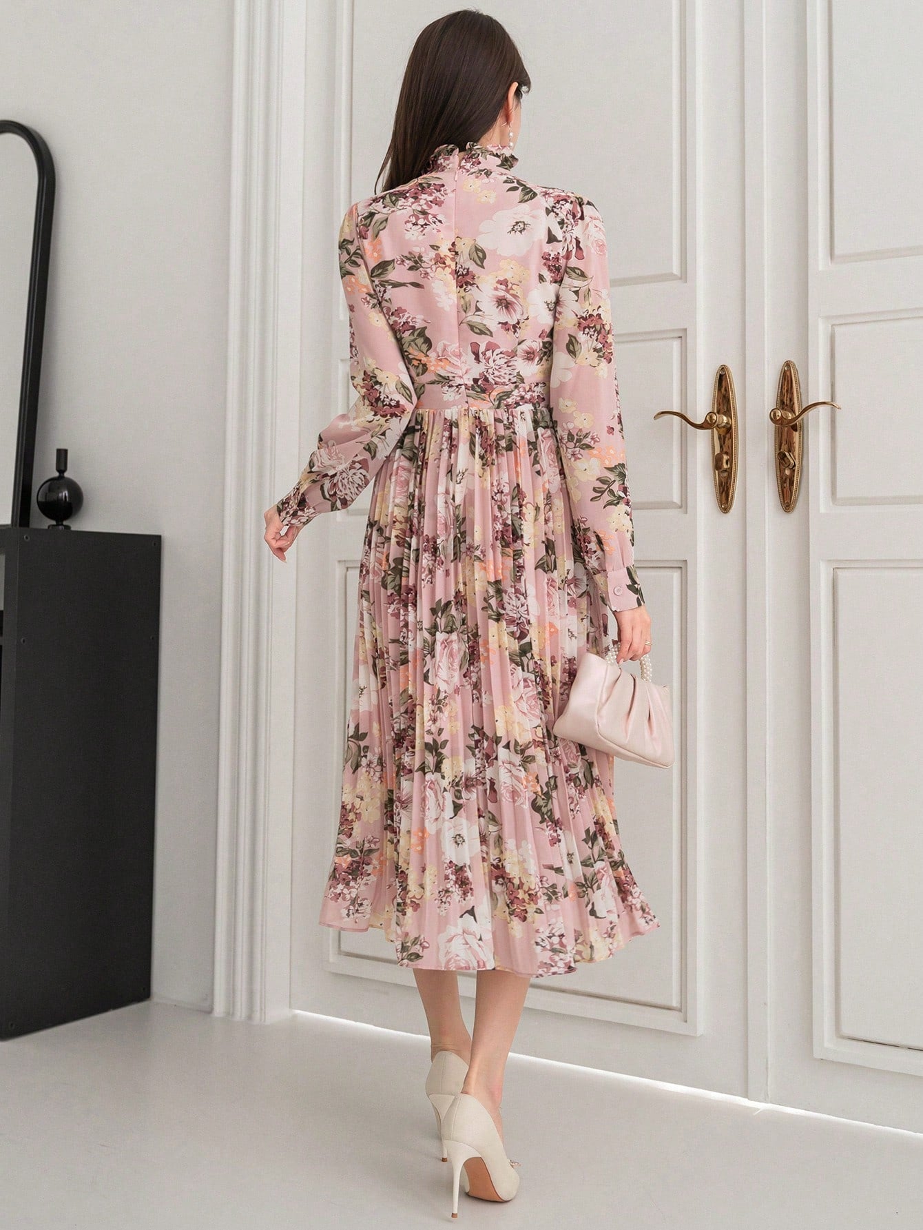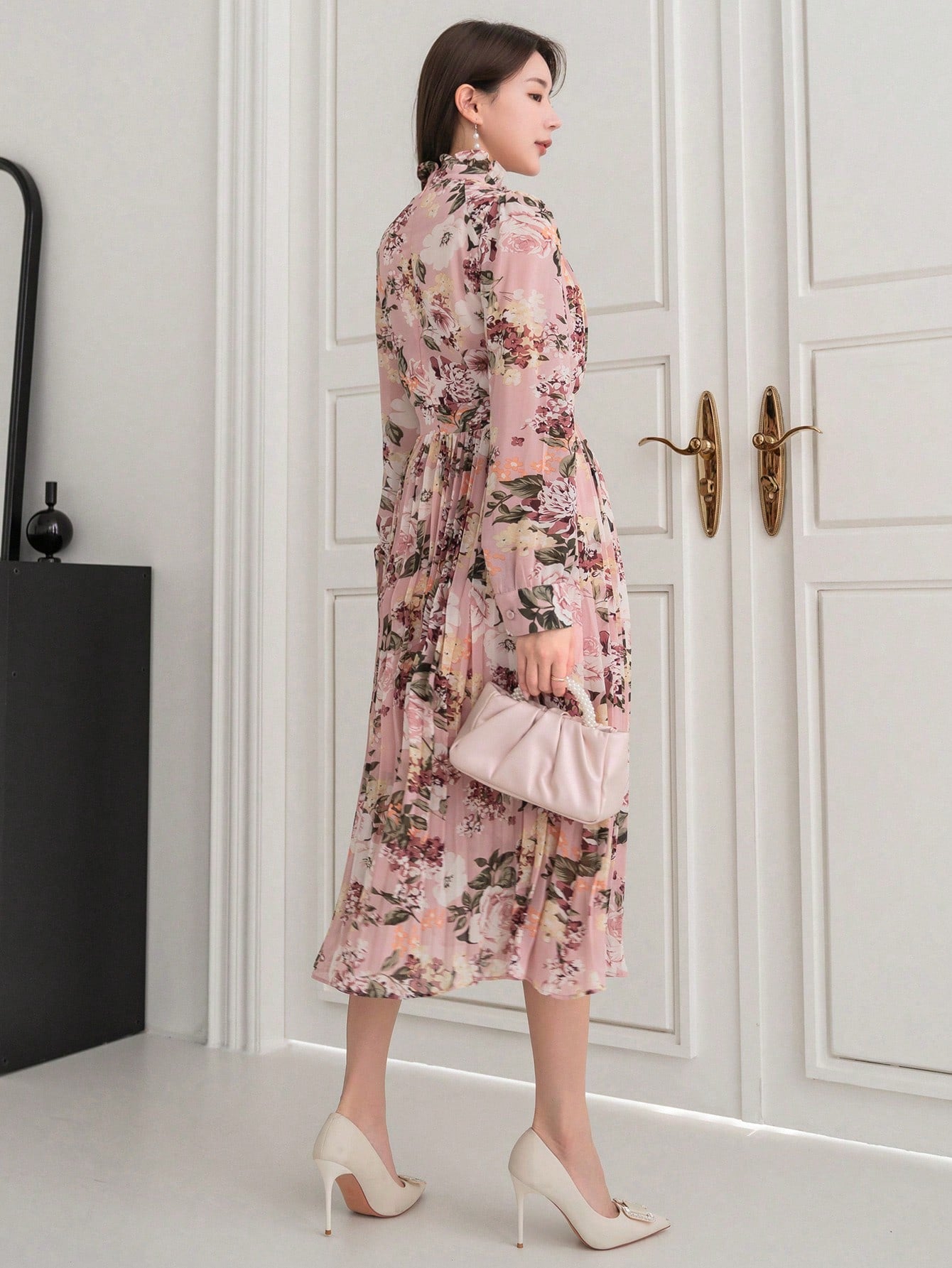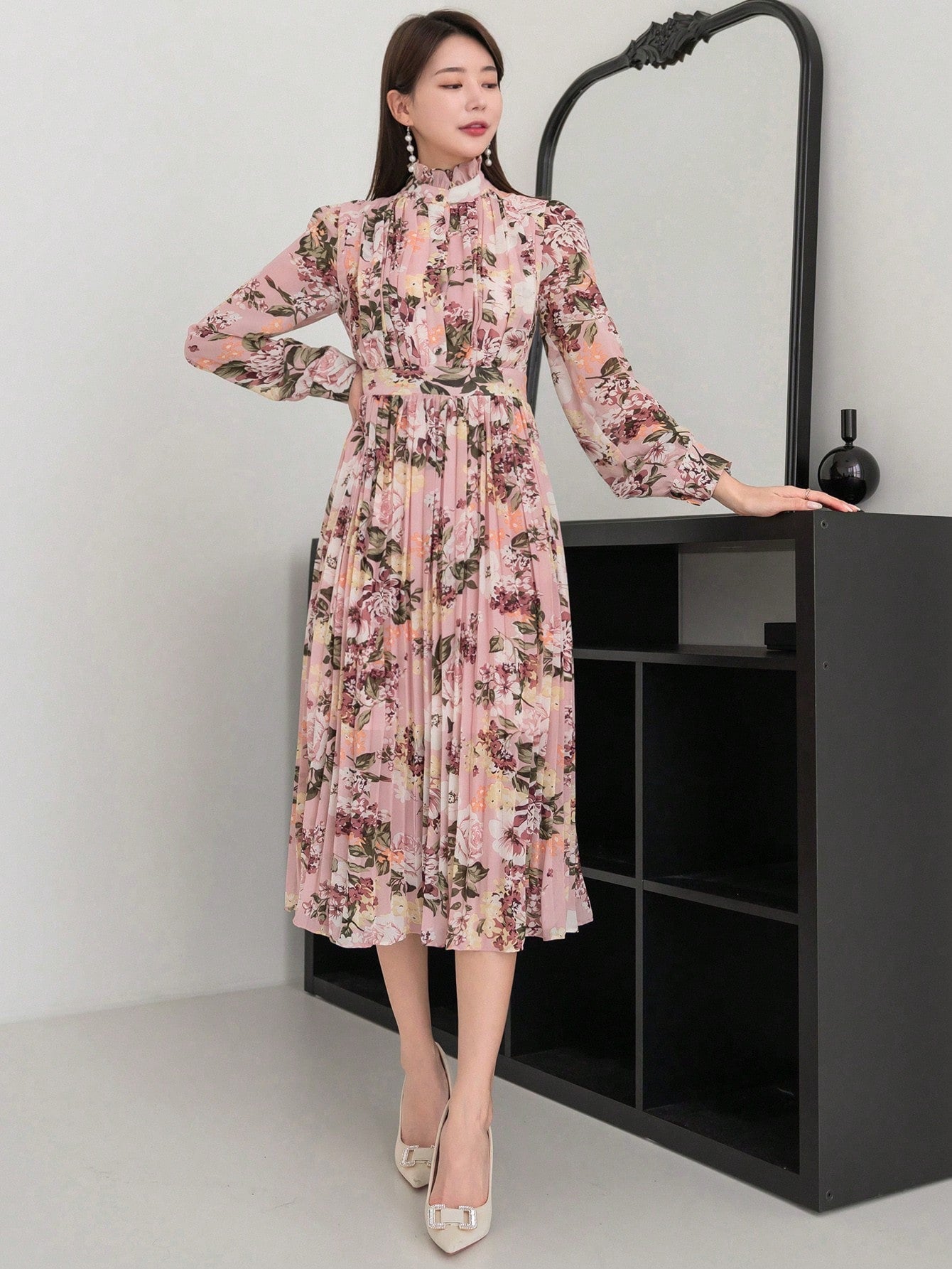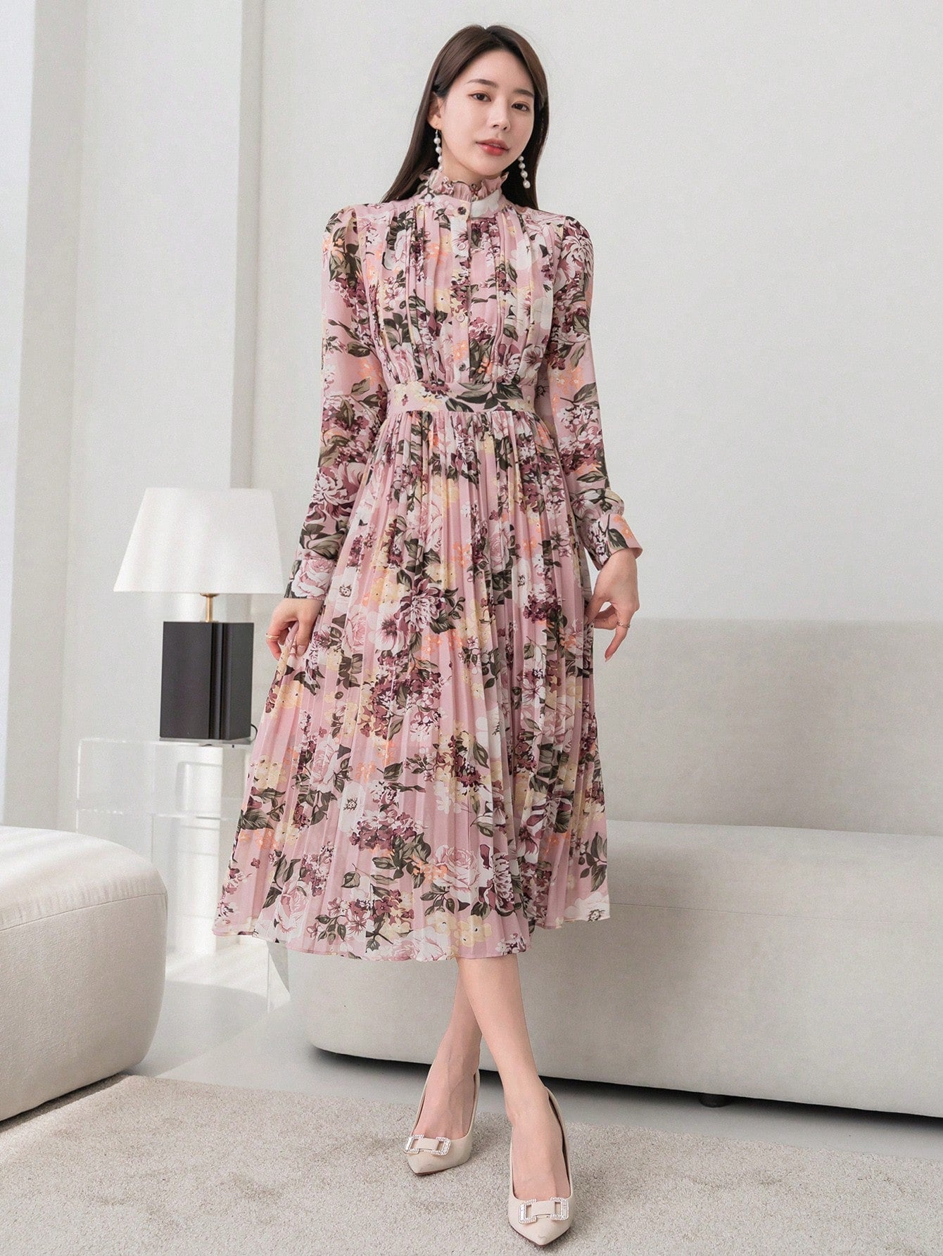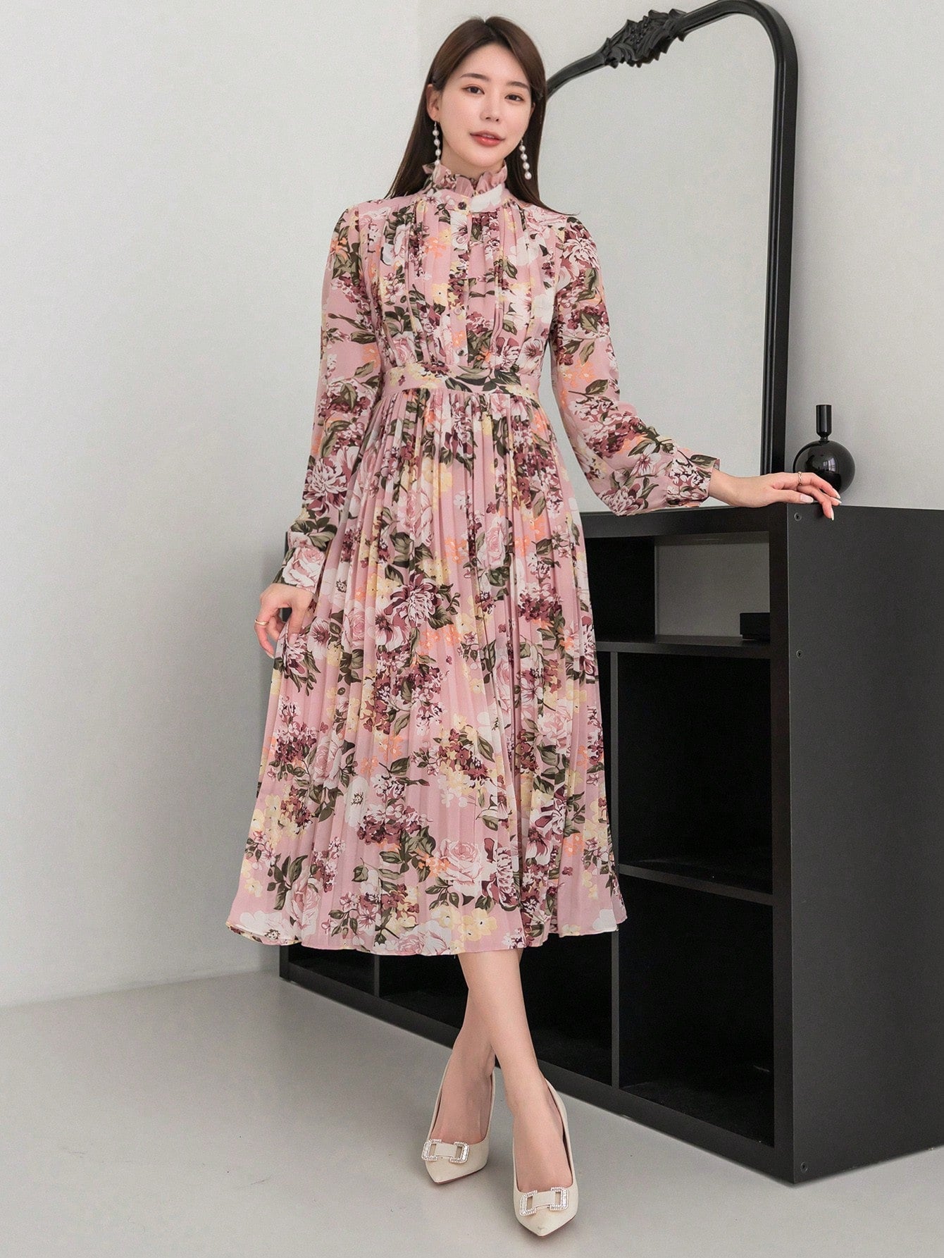 DAZY Women's Stand Collar Floral Printed Pleated Dress With Ruffles