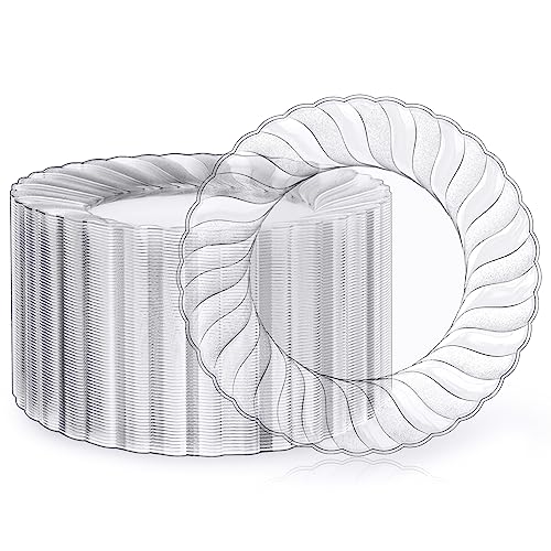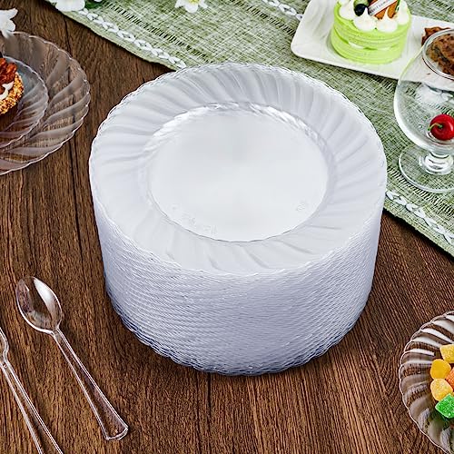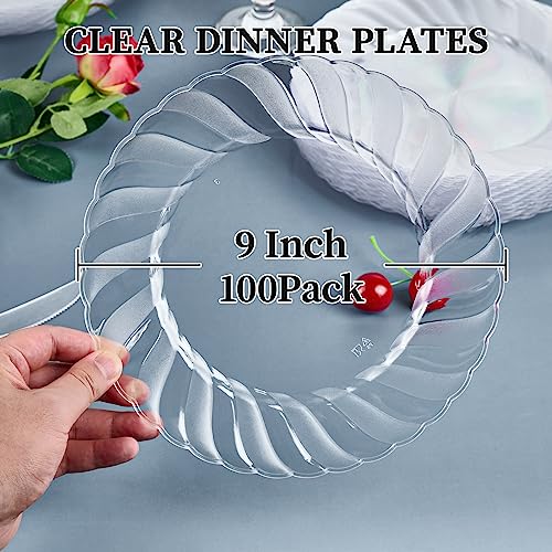 FOCUSLINE 100 Count Clear Plastic Plates 9 Inch, Disposable Heavy Duty Plastic Dinner Plates- Premium Hard Plastic Plates Fancy Disposable Clear Plates for Weddings, Parties and Events